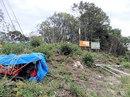 <主郭の現状1> 主郭と考えられる丘陵最高地点では、鉄塔の建設が進められているところだ。 あちこちに機材が置かれている。 |