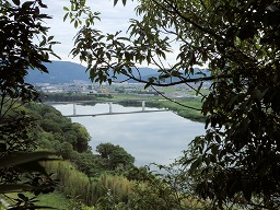 <祠の箇所から北東を望む> こちらからのほうが吉井川の流れがはっきり判る。 ここから丘陵北側の麓に向けて道が降っているので、こちらからも登れると思われる。 |
