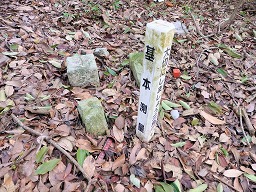 <三角点> 祠の箇所から南側の雑木林に潜ると三角点がある。 |