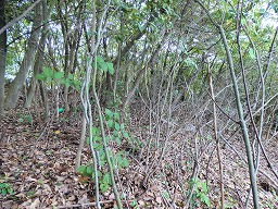 <三角点東側> 城としての痕跡を求めて東端へと進むが、雑木が激しく進めない。 ここの箇所から南に降ると工事現場に出るため、そこから東へ進めばもう少し東進可能であるものの、以前に訪れた際に何も見つけられなかったので、今回はここで諦めた。 |
